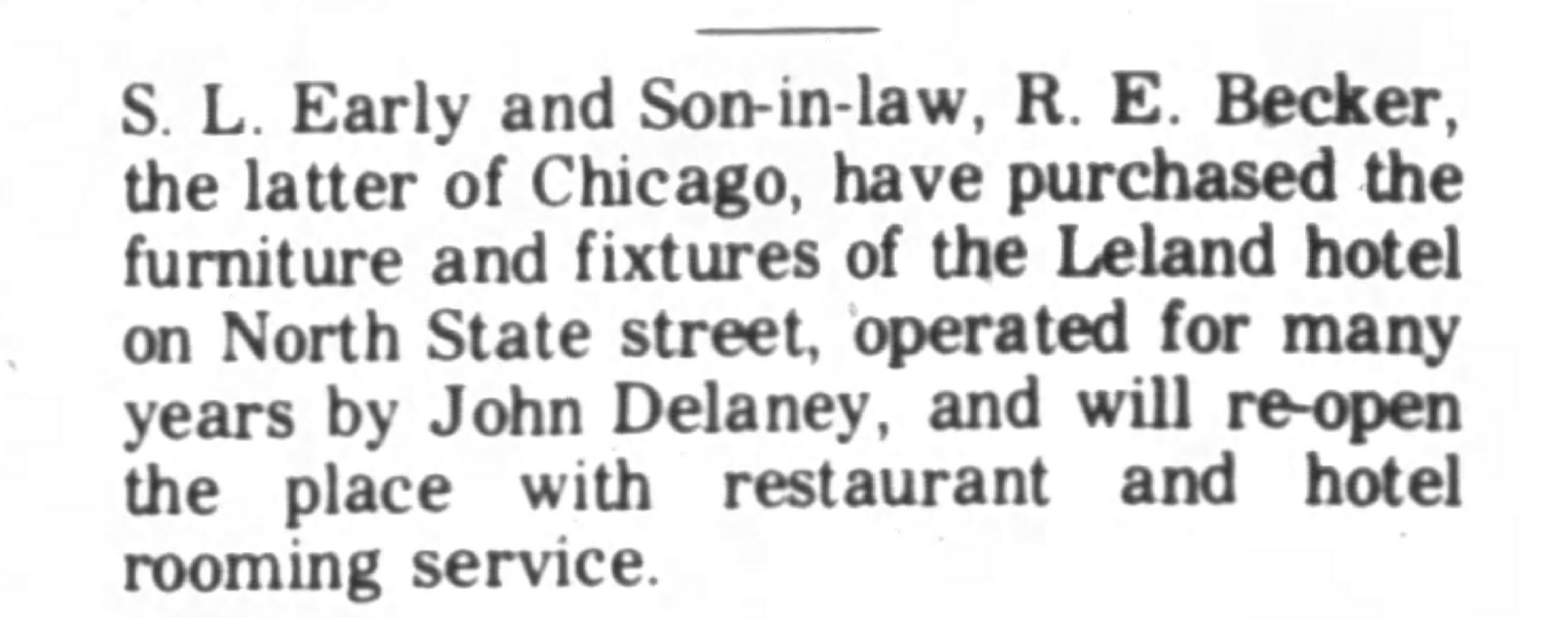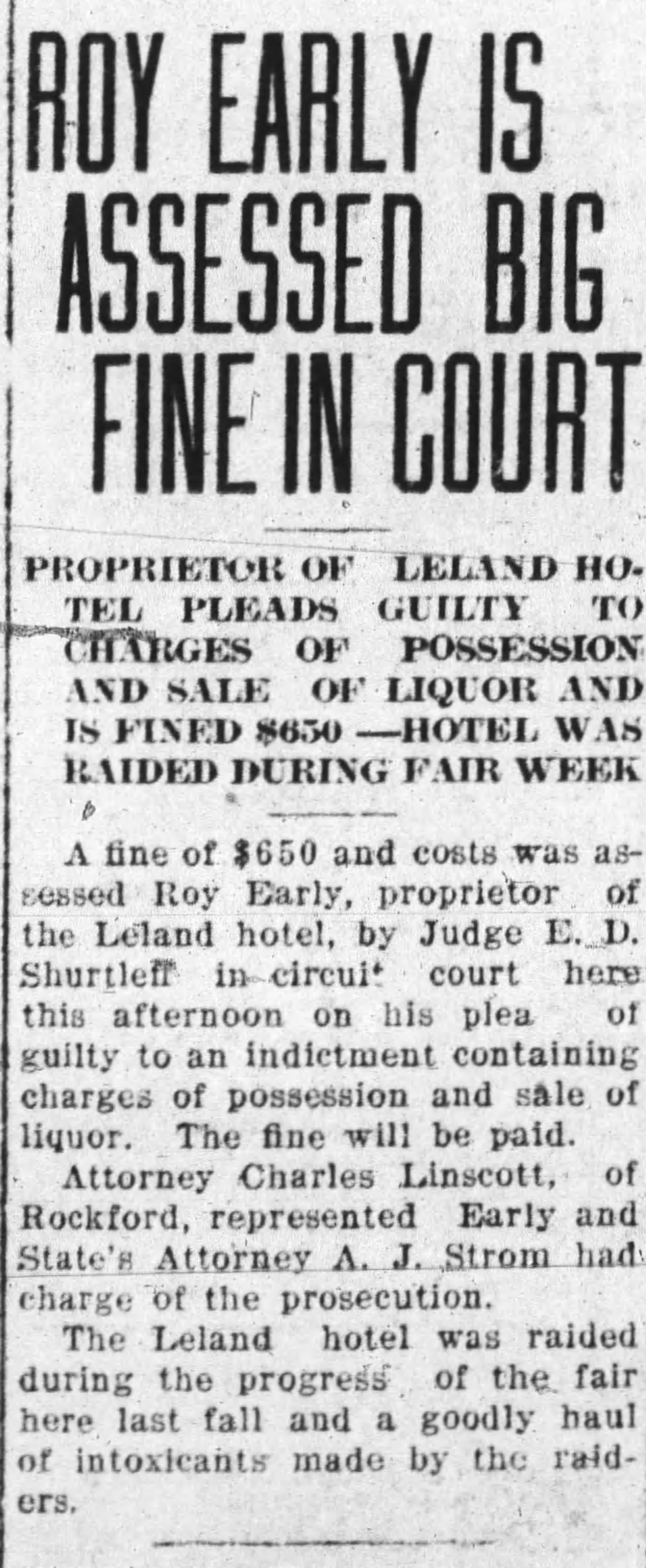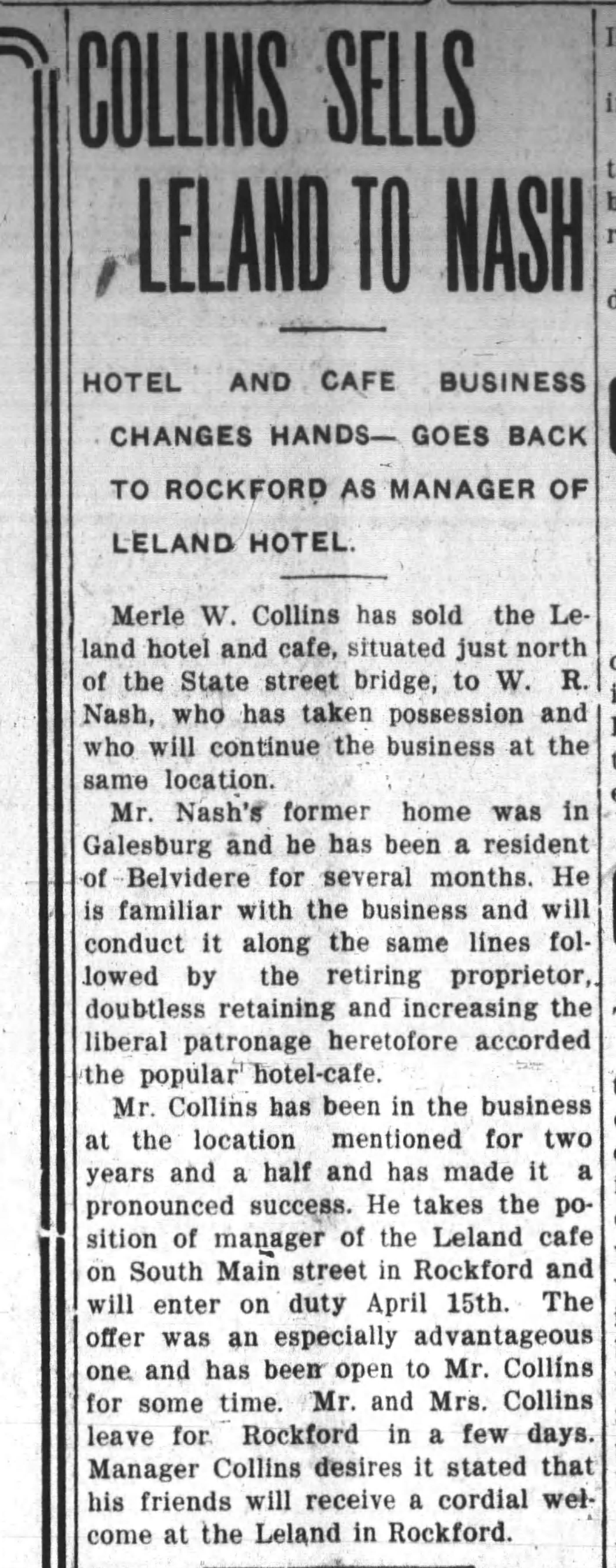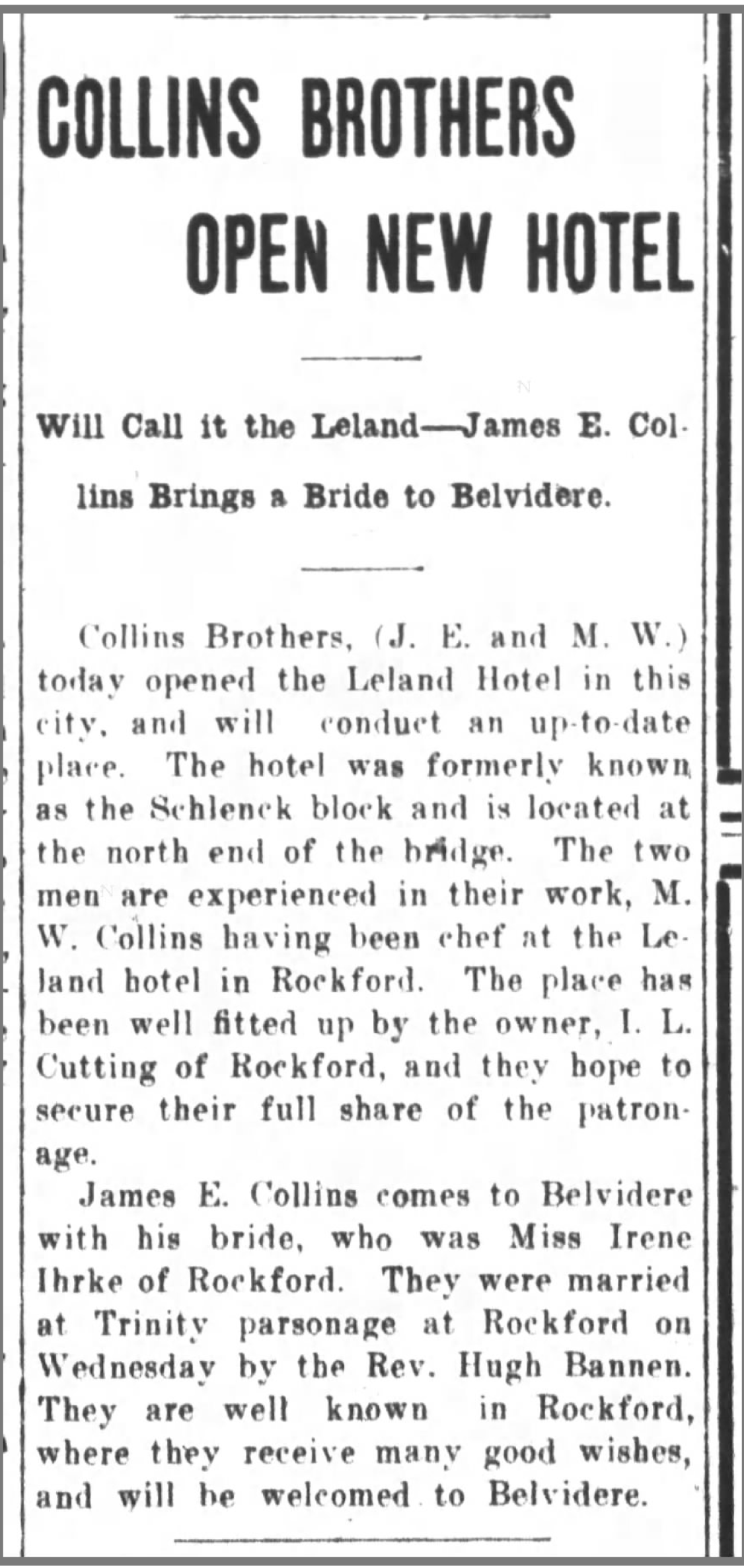 Leland was a popular name for Illinios hotels in the early 20th century. There was a Leland Hotel in Springfield, Rockford, and Belvidere. I was walking north on State Street in Belvidere and saw a large, painted sign on the side of a building as I crossed the river. I was immediately intriqued; especially by the door close to the river. I imagined it was a perfect setup for delivering liquor during prohibition.