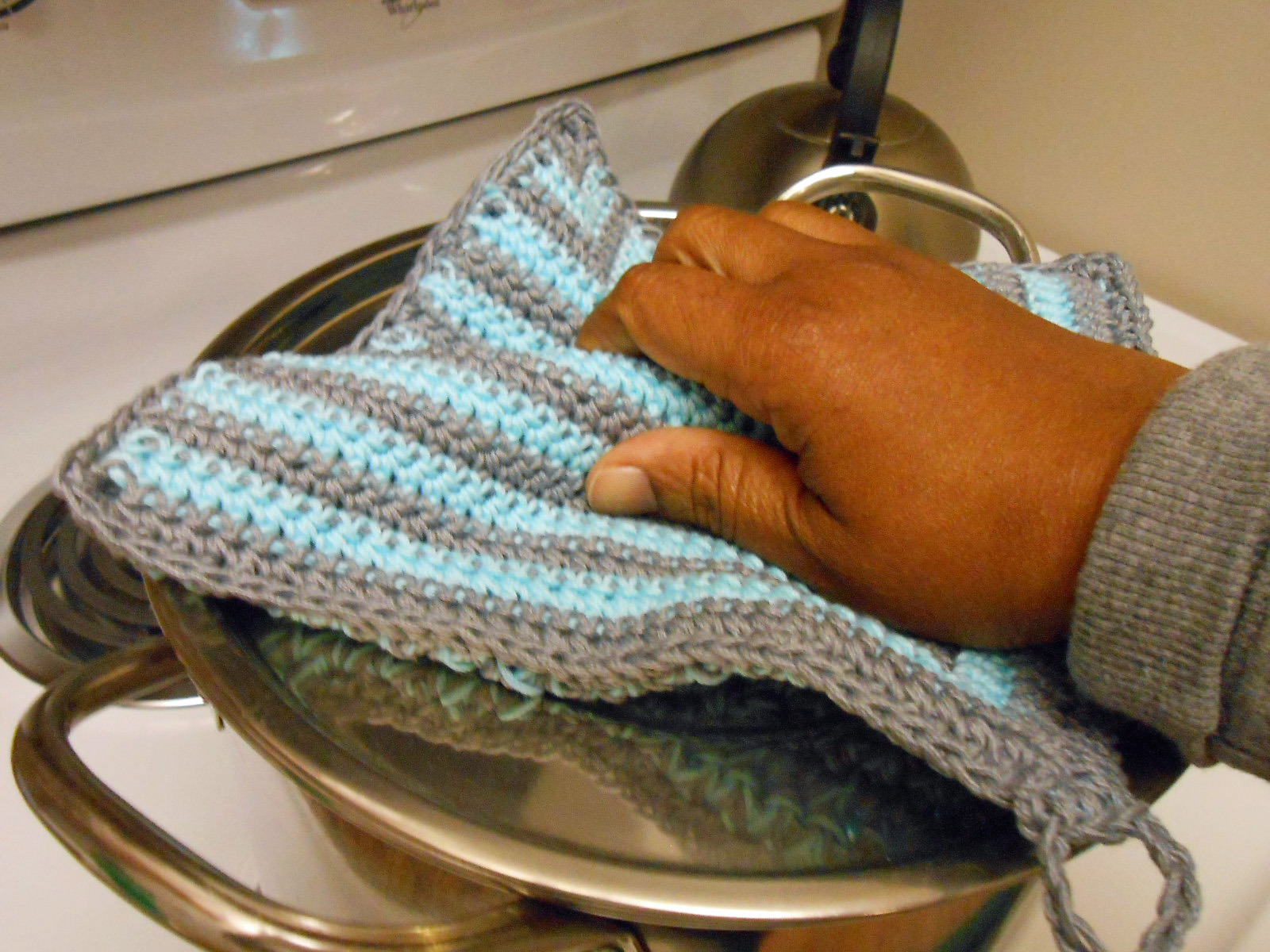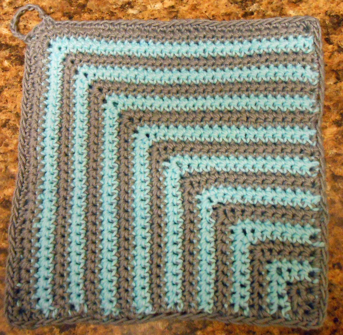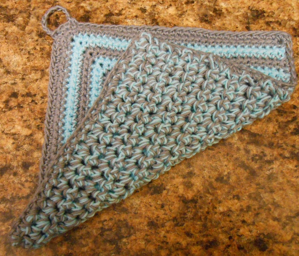 This potholder has a finished size of 8 inches square. The back is all single crochet, using two strands of medium cotton – Lion Brand Yarns, 24/7 cotton, aqua and silver. The pieces were put together with a single crochet stitch all around.
