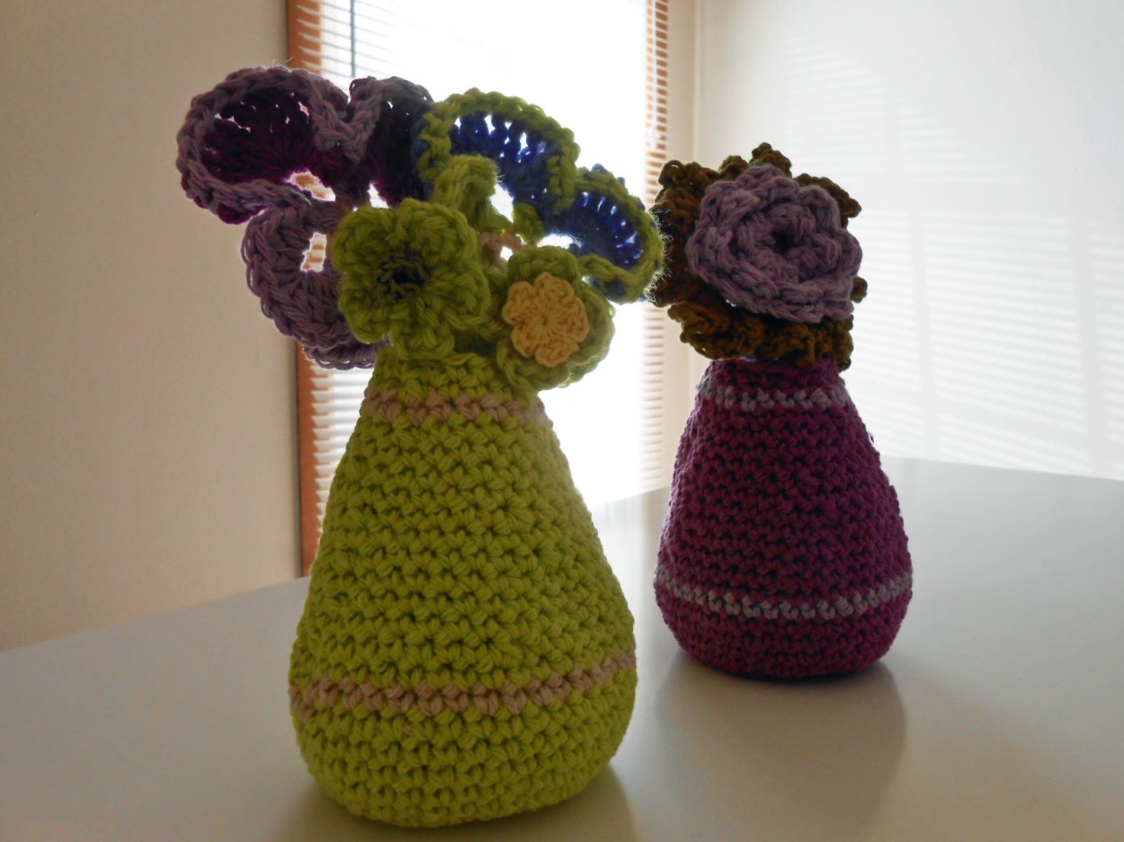 Rnds 8 – 13 : 1 sc in first st. 1 sc in each st to end of rnd. Note: I worked in a different color for rnd 12 in 2 of the vases I made. This video shows a good way of doing colorwork – Colorwork and Tapestry Crochet with Red Heart Yarns
