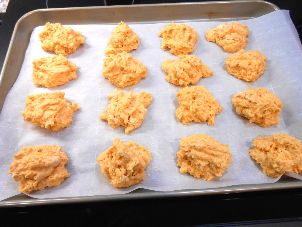 | 6. | Spoon out dough with a tablespoon onto the cookie sheet in 4 rows of 4 mounds. |