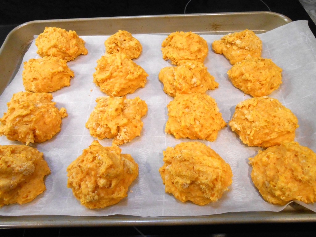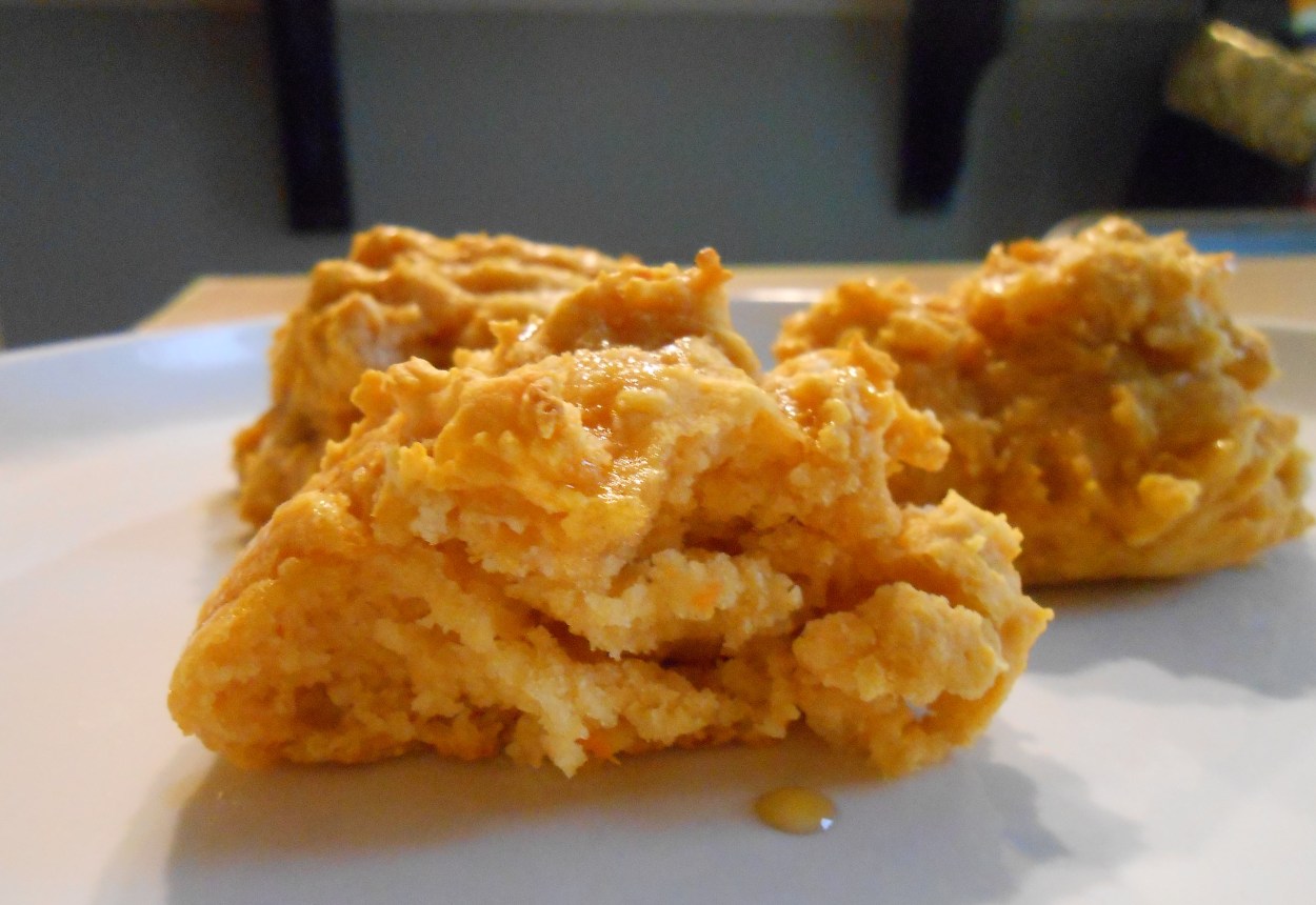 The last time I made roll out biscuits they were overworked and tough. However, the last time I made drop biscuits they were almost melt in your mouth delicious. I combined the recipe in American Heart Association Cookbook for drop biscuits with a sweet potato biscuit recipe from Chowhound to make my recipe. When they were hot out of the oven, I poured maple syrup over them. It was exactly the taste I sought to enjoy.