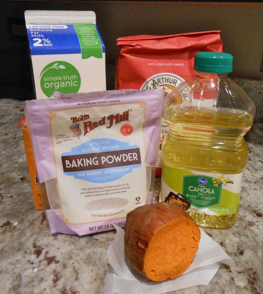 | 2 cups all-purpose flour 1 tablespoon baking powder 1/2 teaspoon sea salt 1/4 teaspoons baking soda | 1 cup milk 1 baked sweet potato (medium), peeled and cut into large pieces 1/3/ cup oil (canola is good) |