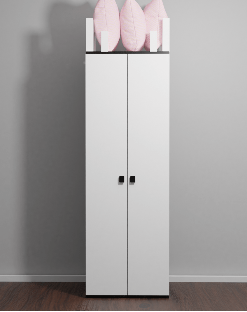 I feel the space above the cabinet can hold lightweight items like pillows or pretty blankets and summer quilts. In this render, I have imagined no frills, 8 inch tall poles that could be made from square wood dowels or 3d printed. Cabinet doors remain white while the rest of the cabinet is painted black.
