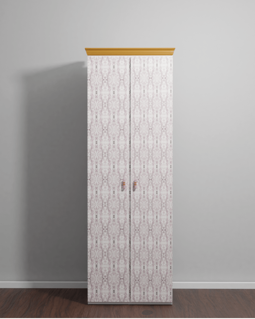 Peel and stick wallpaper is added to the doors of this cabinet example. The pattern is Brush King Protea Art Deco from Spoonflower.
