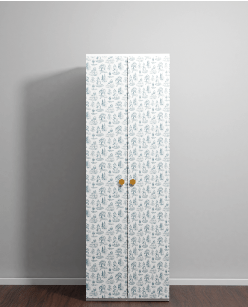 This last render is also a peel and stick wallpaper pattern from Chasing Paper, Tree Toile. The knobs are gold hexagons that would require 3d printing.